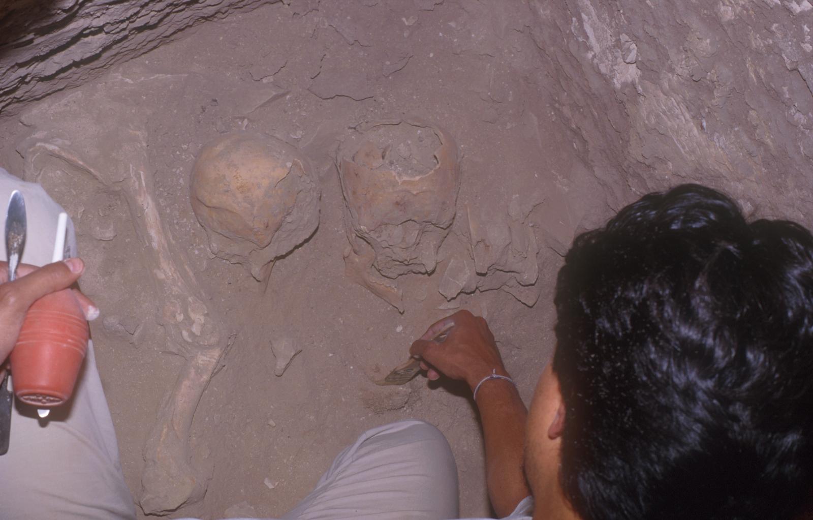 Careful cleaning of the tomb’s decorated but badly-damaged walls revealed the names of several sons of Ramesses II and fragments of four Canopic jars found in the flood debris in Chamber 2 confirmed those and gave two more, a total of four. The names are: Amunherkhepeshef, Rameses, Sethy, and Mery-Atum. Of the thirty sons of Rameses II, these are numbers 1, 2, 9, and 16 in lists of the sons of born to his principal wives. One complete human skeleton and the fragments of three others were found dumped in a Burial pit in Chamber 2, and a study by forensic anthropologists identify two as ”most probably” related to Rameses II, a third as “likely” related, and the fourth as too fragmentary to tell. They may be the remains of the four sons whose names we have found on walls and canopic jars.