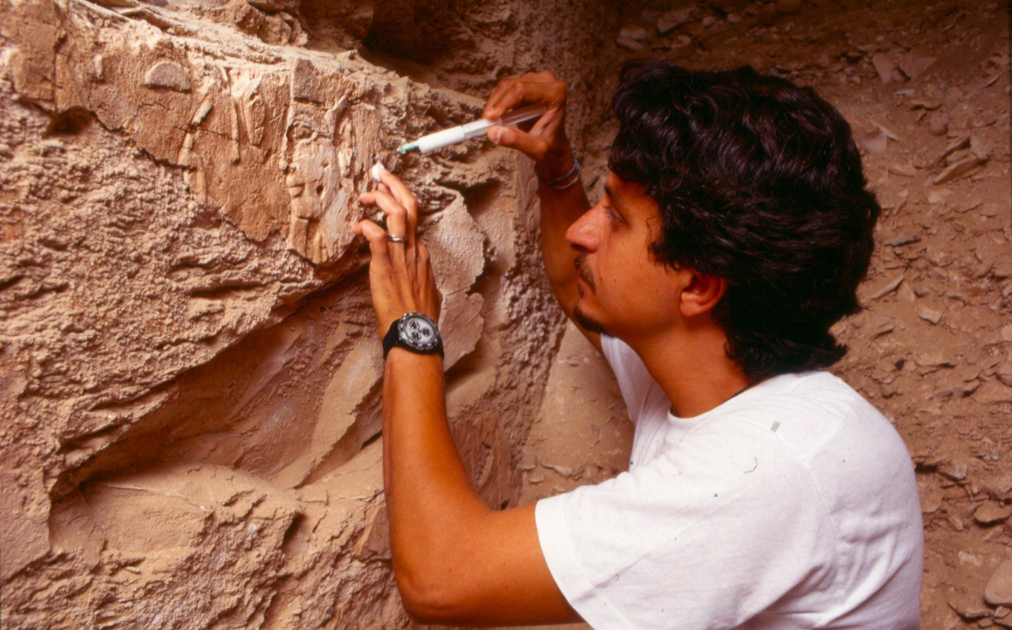 Not only must every wall relief and object be recorded, but they must be protected from further damage. The Theban Mapping Project conservator has one of the most difficult jobs on the project. KV 5 has suffered over the last three thousand years from ancient theft and vandalism, and most of all, from flooding. The latter has caused the painted plaster surfaces of entire walls to slide to the floor. The remaining plaster has to be cleaned and strengthened. Objects recovered, many badly broken, also have to be cleaned and pieced together.