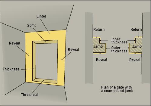 Movement from one corridor or chamber to the next was restricted by a gate that could be closed off, either with wooden door leaves, or blocked by stones or bricks. The gates are composed of several elements. These include the lintel and soffit which are the vertical and horizontal surfaces above the opening respectively, as well as the threshold. The jambs are the sides of gates. Each jamb had three parts, from front to back, the reveals, the thicknesses, and the returns. Some gates have jambs that project farther out from the corridor walls on the reveals than on the returns, so that the thickness has two planes one deeper than the other, called outer and inner thicknesses.
