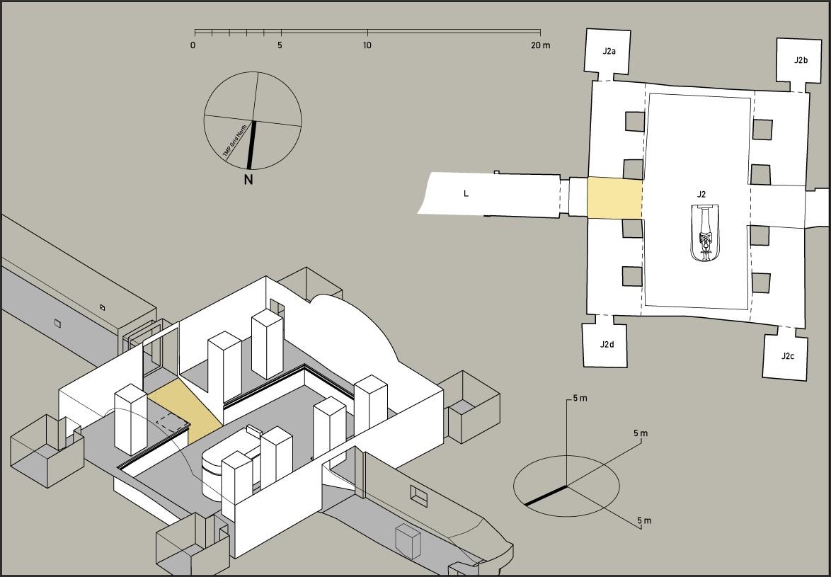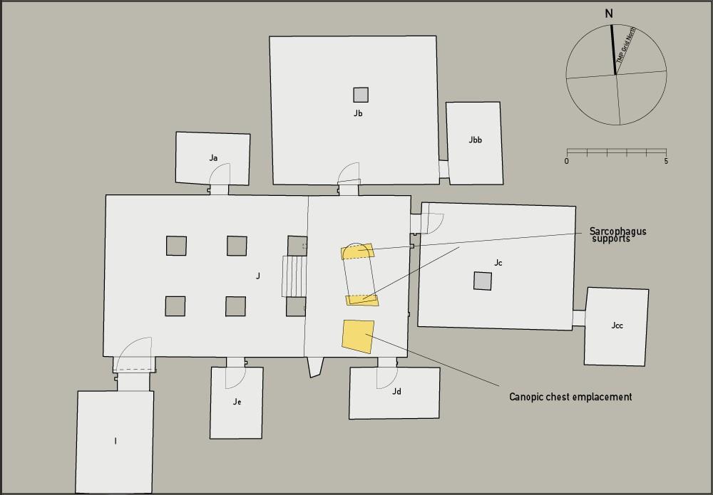 J is the most important part of the tomb, and from Thutmes III onwards, New Kingdom royal examples were always decorated. The apparent exception, KV 43, may be the result of lack of sufficient time to carry-out the decoration after the Thutmes IV's death, since the walls had only been smoothed before plastering.