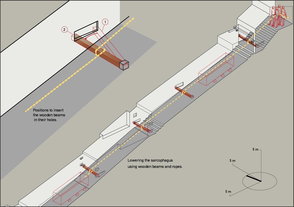 These specialized recesses were cut in pairs in corridor walls opposite each other, one square and the other rectangular, increasing in depth from the front to the back of the tomb. One end of a wooden beam was inserted into the square hole and the other swung in an arc into the rectangular hole. Ropes were passed around the beam and attached to a sarcophagus down-slope, and then would be carefully released to control the descent of the sarcophagus to the horizontal surface between the bottoms of the jambs.