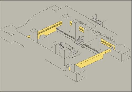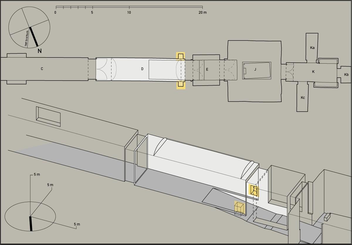 In tombs of Dynasty 18, this chamber served as a location for the change from one angle of axial orientation to another. During that dynasty, beginning with KV 34, the hall contained only two pillars and the stepped descent in the floor was set to the side.