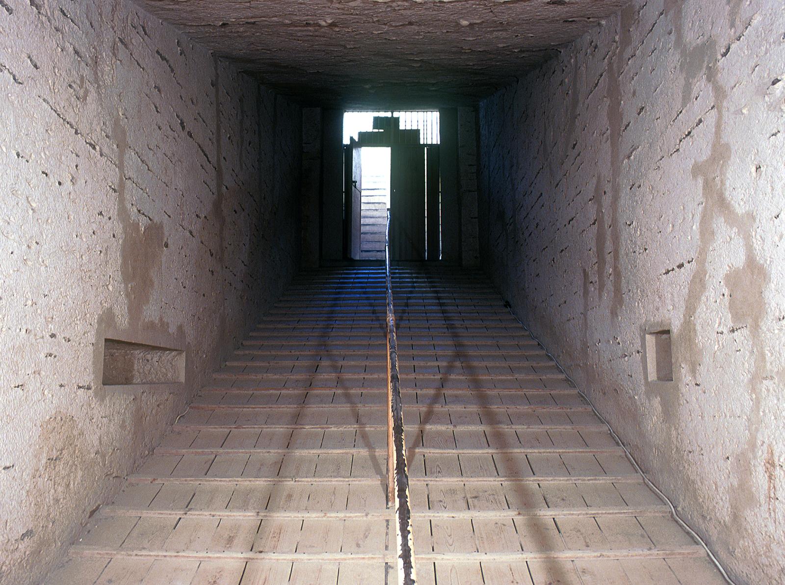 These shallow recesses occur directly after gates in sloping corridor ceilings. They were intended to accommodate the horizontal tops of door leaves serving to close the gates, when they were opened. Even when corridors later became more level these ceiling recesses are retained.