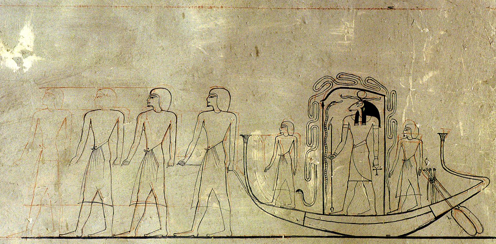 Book of Gates, fifth division (P)/sixth hour (H), scene 37: towing solar boat, preliminary sketch, with corrected figures in black.