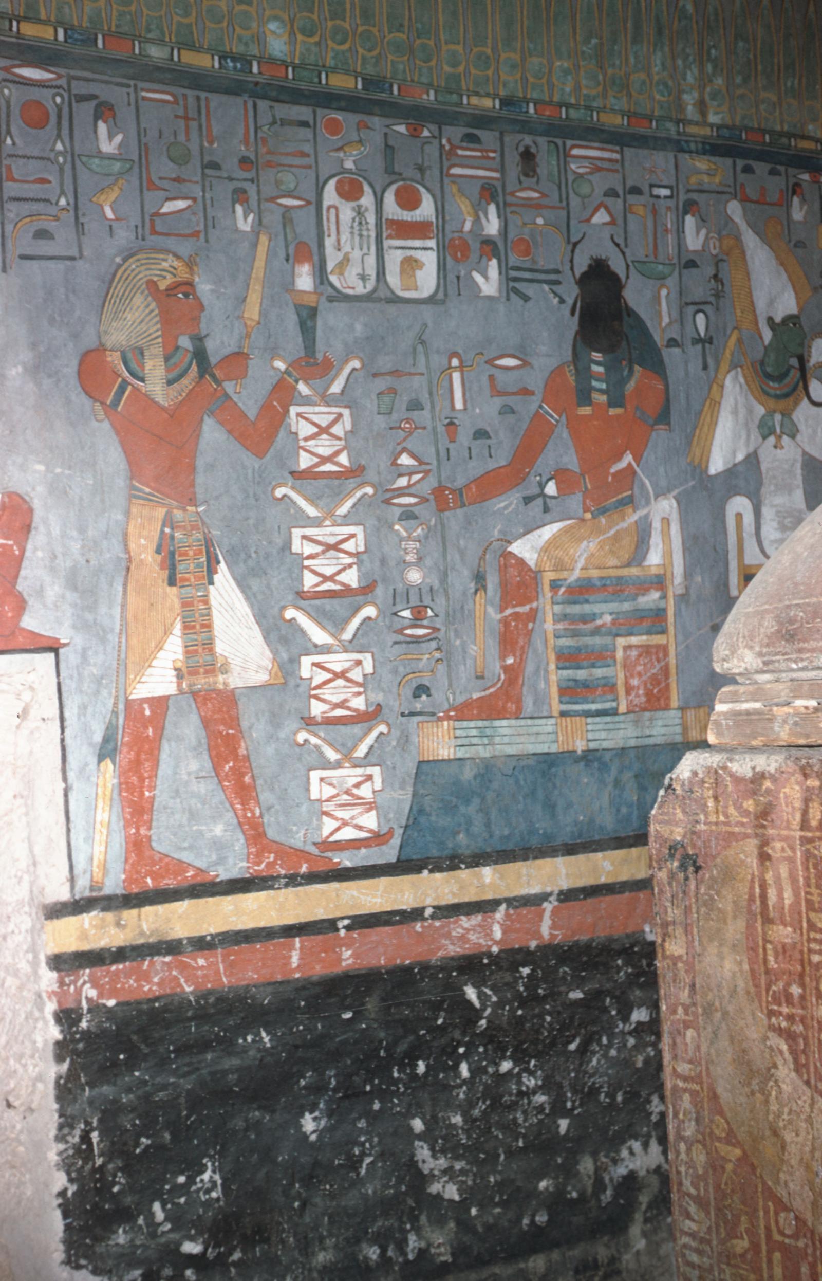 Rameses I (with the souls of Nekhen and Pe) and consecrating meret-chests before the syncretic god Atum-Ra-Kheperi, Burial chamber J, rear wall (left part). Courtesy of Uni Dia Verlag; Uni Dia Image Nr. 35657.
