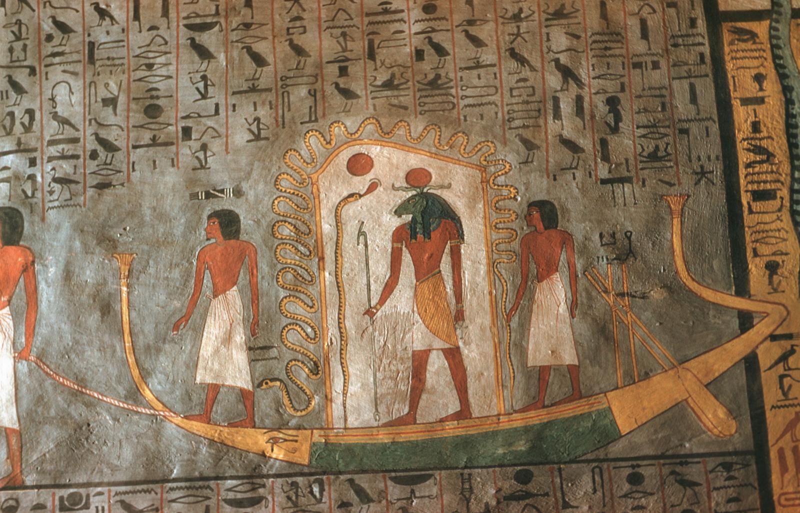 Detail of the god Amun-Ra in the Book of Gates second division (P)/third hour (H), middle and lower registers, Burial chamber J, right (northwest) wall (right part) Courtesy of Uni Dia Verlag; Uni Dia Image Nr. 35668.