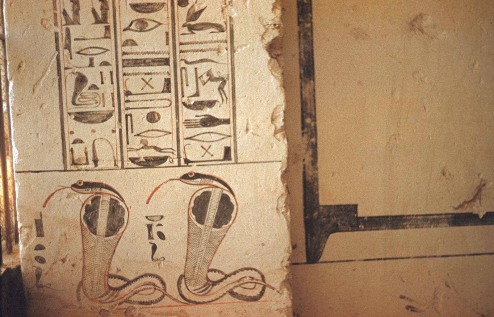 Detail of Nephthys and Isis as fire-spitting cobras, Gate B, left thickness. Courtesy of Uni Dia Verlag; Uni Dia Image Nr. 36481.