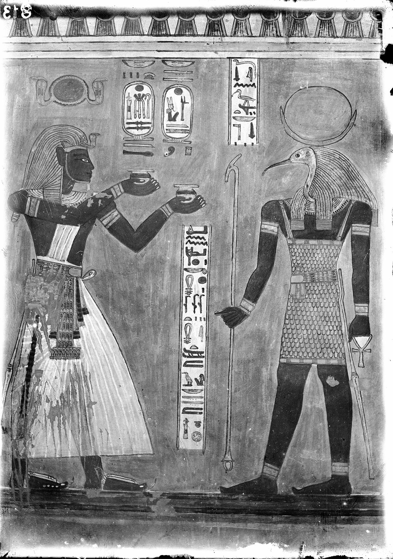 The tomb of Prince Khaemwaset (QV 44) photographed during Ernesto Schiaparelli's excavations that depicts Rameses III offering to Thoth. Italian Archaeological Expedition excavations. Courtesy of the Egyptian Museum in Turin.