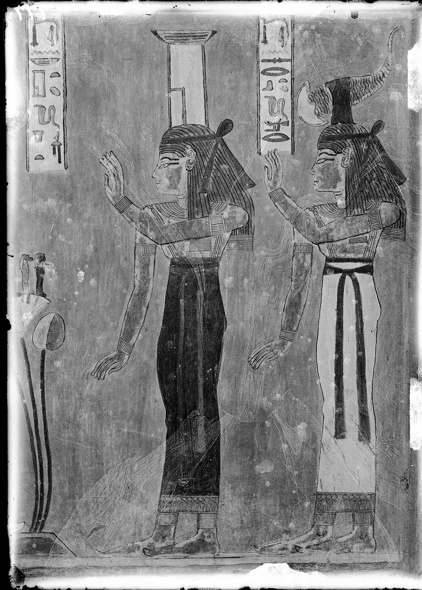 The tomb of Prince Khaemwaset (QV 44) photographed during Ernesto Schiaparelli's excavations. Nephthys (left) and Serqet (right) before Osiris (and not visible here). Italian Archaeological Expedition excavations. Courtesy of the Egyptian Museum in Turin.