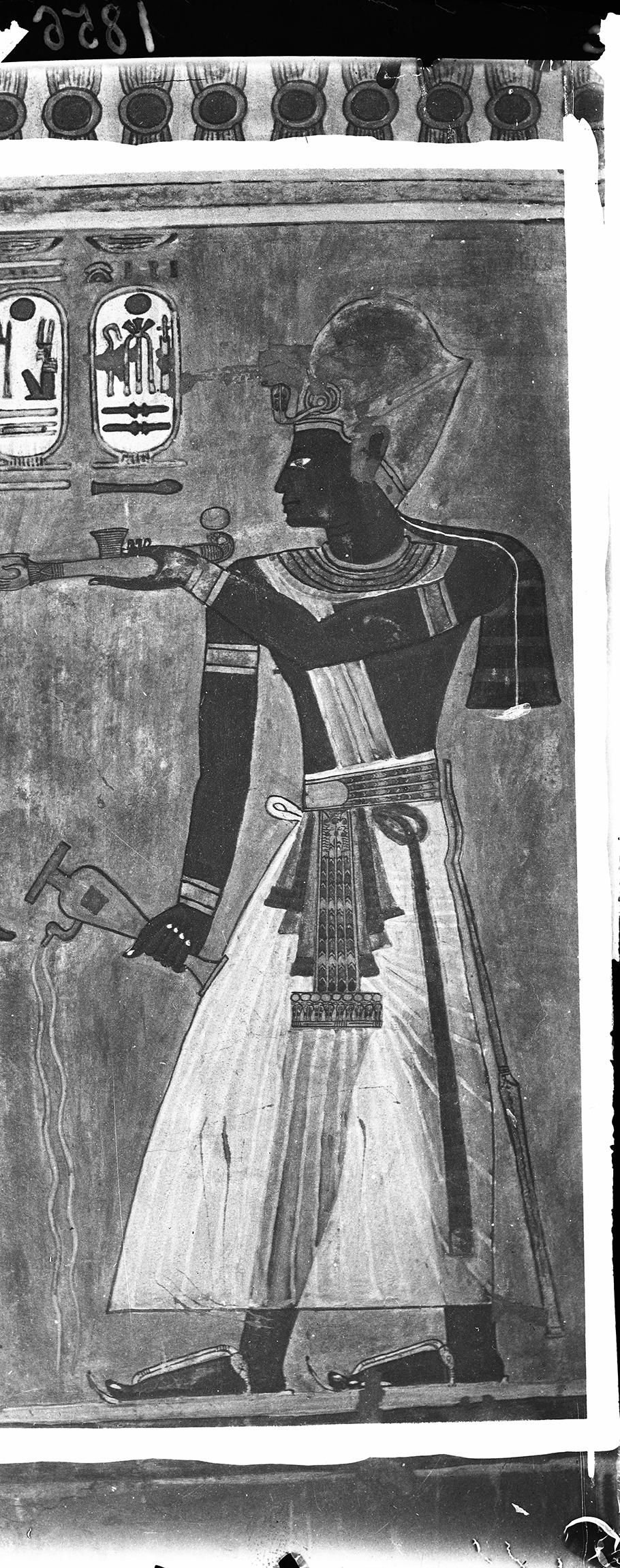 The tomb of Prince Khaemwaset (QV 44) photographed during Ernesto Schiaparelli's excavations that depicts Rameses III censing and libating before Horus (not visible here). Italian Archaeological Expedition excavations. Courtesy of the Egyptian Museum in Turin.