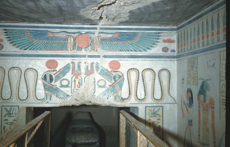 Interior of the tomb of Prince Amenherkhepshef (QV 55) at the time of its discovery with the prince's granite sarcophagus in the burial chamber framed by wall scenes of him and his father Rameses III with the goddesses Isis (left) and Hathor (right). Italian Archaeological Expedition excavations. Courtesy of the Egyptian Museum in Turin.