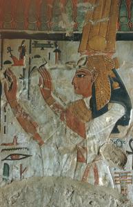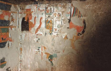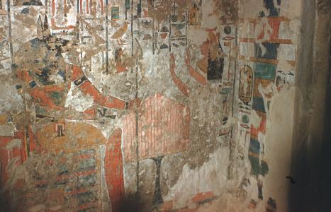 South wall of side chamber Dc in the tomb of Queen Nefertari (QV 66) perhaps photographed during excavations. Detail of seated Anubis and Isis in front of which Queen Nefertari presents offerings (not visible here). Italian Archaeological Expedition excavations. Courtesy of the Egyptian Museum in Turin.