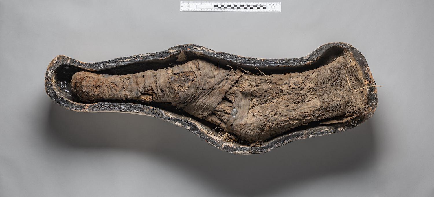 Carved wooden container with a victual (food) mummy of beef thigh meat from the tomb of Imhotep (QV 46). Courtesy of the Egyptian Museum in Turin (S.5077).