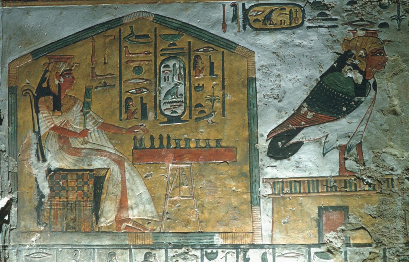 The queen playing senet and as ba-bird, chamber B, south wall (left part). Courtesy of Uni Dia Verlag. Uni Dia Image Nr. 36803.
