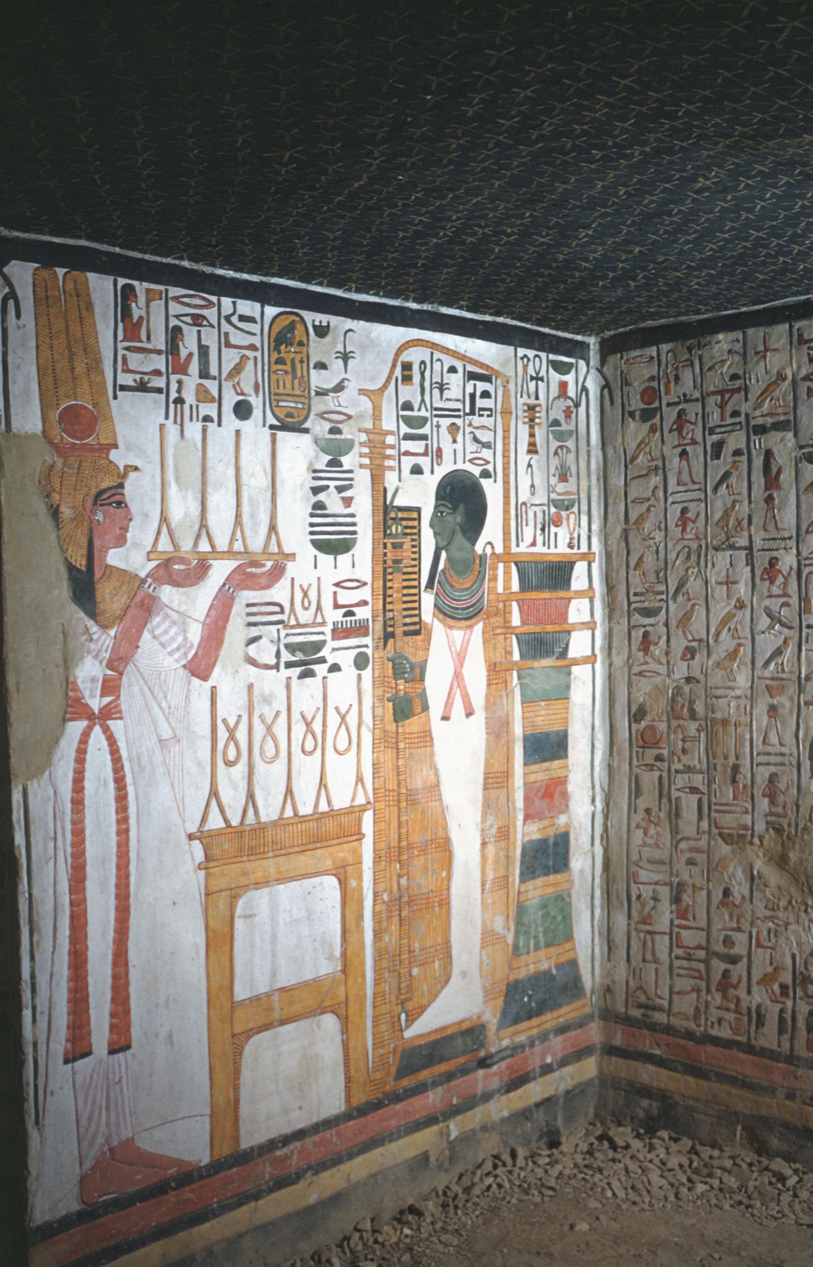 The queen offers linen to the god Ptah, the front (west) wall of Side chamber Ba. Courtesy of Uni Dia Verlag. Uni Dia Image Nr. 36827.