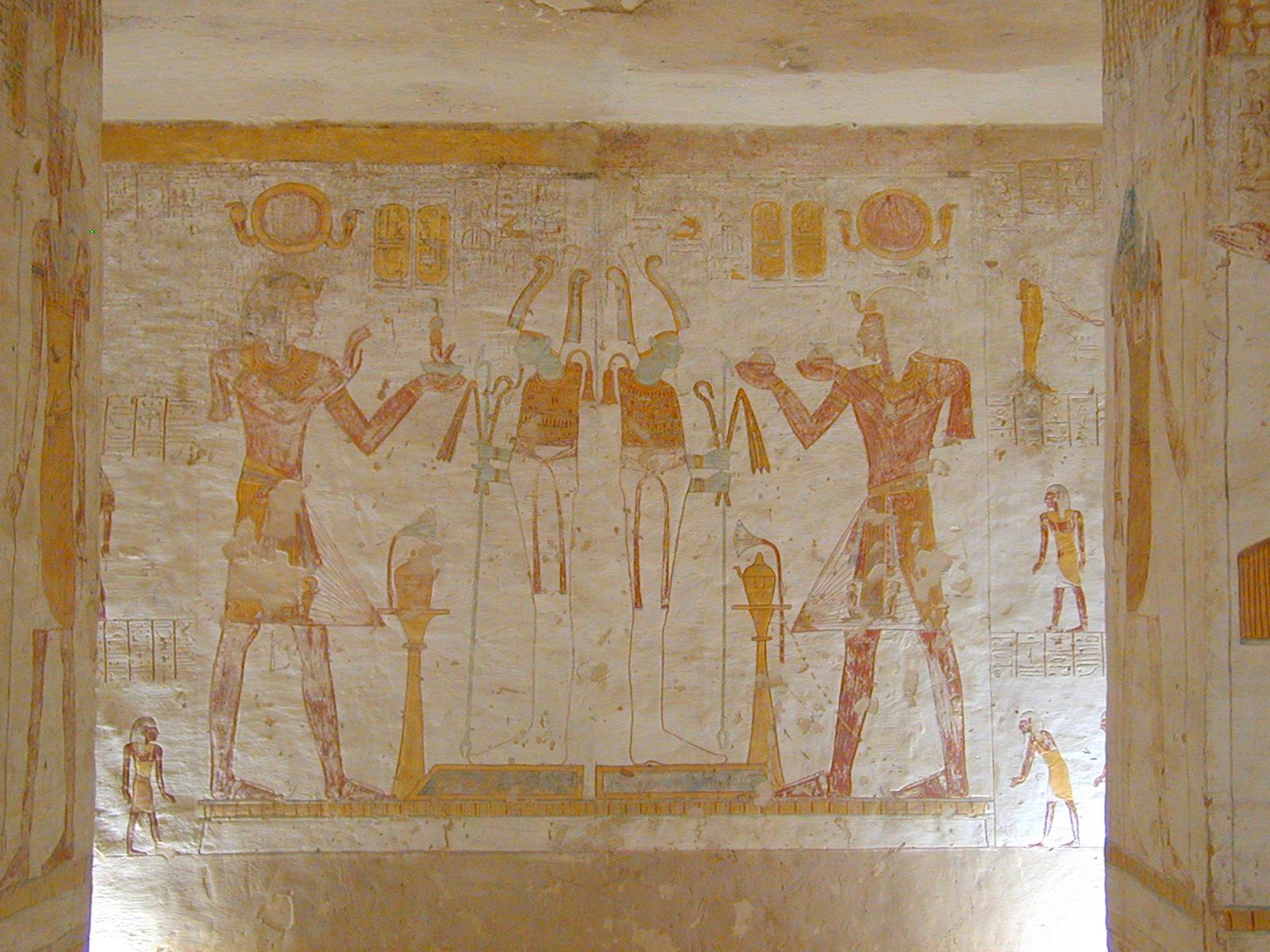 Sety II offering order (left) and nw-jars (right) to statues of the deity Osiris; rear wall, upper part, Pillared chamber F. Courtesy of Richard Sellicks.