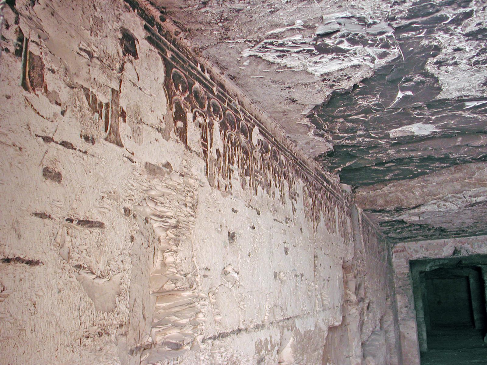 View of Corridor B, left wall. Detail of uraeus and cartouche frieze; remains of deities wearing sun discs. Courtesy of Richard Sellicks.