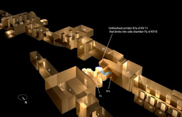 Tomb plans up until corridor C (KV 11) and pillared chamber F (KV 10), with orientation of the tombs reversed from actual relationship.