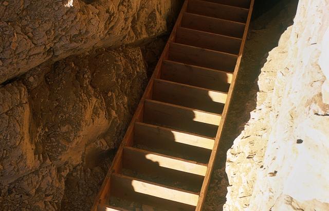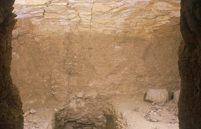 See entire tombThis roughly cut chamber has suffered ceiling collapse. A steep staircase descends through the floor to the left (south) of center.