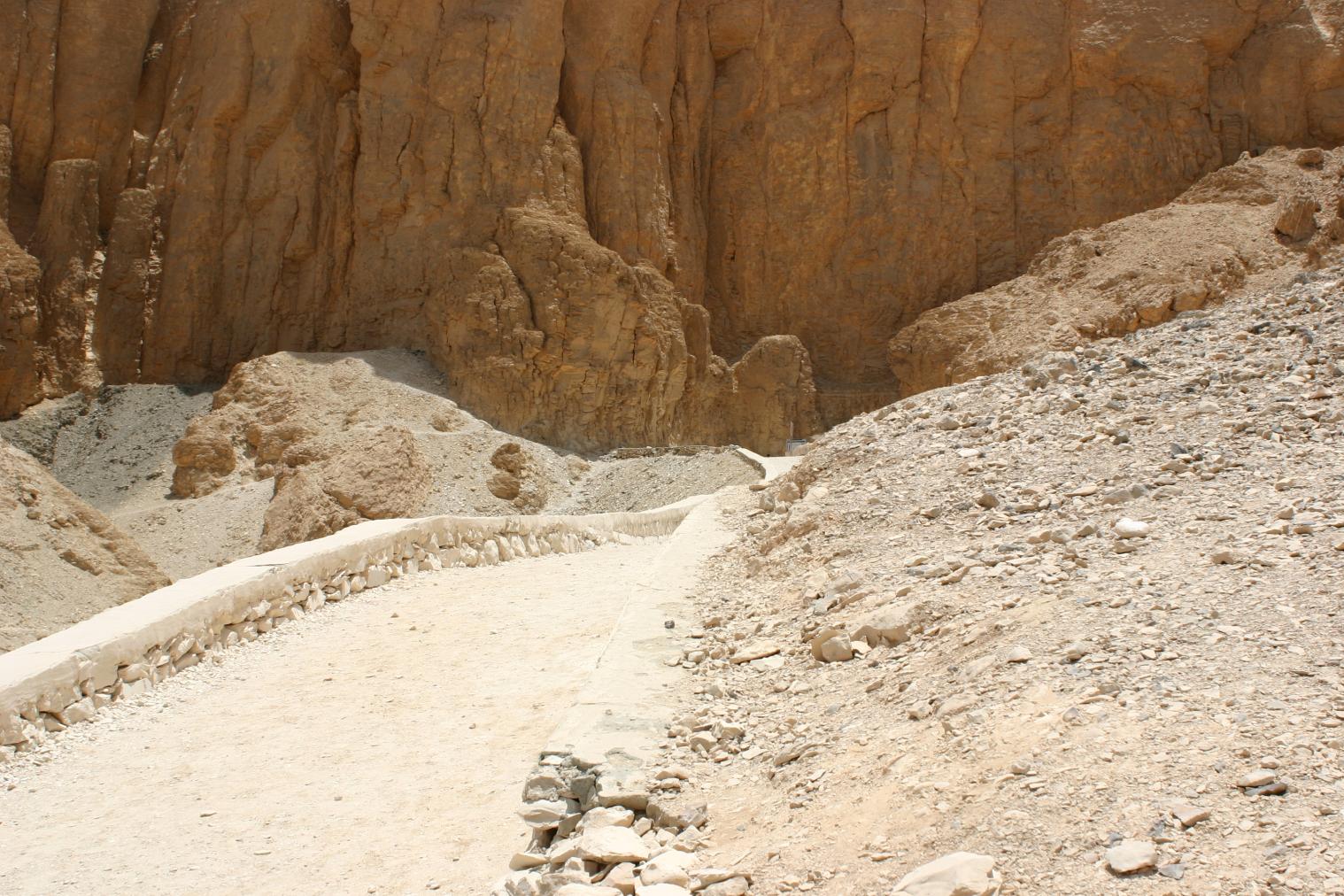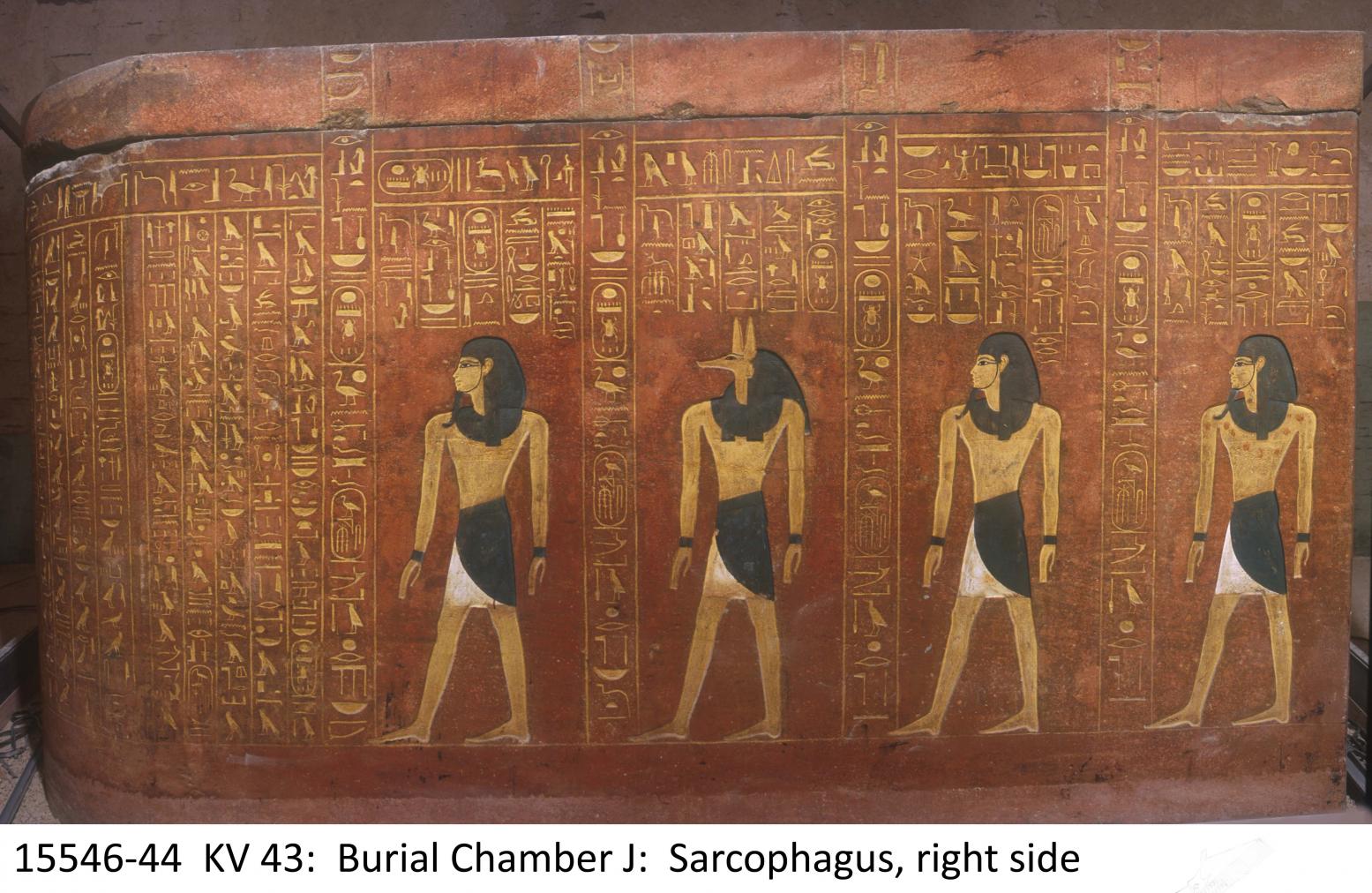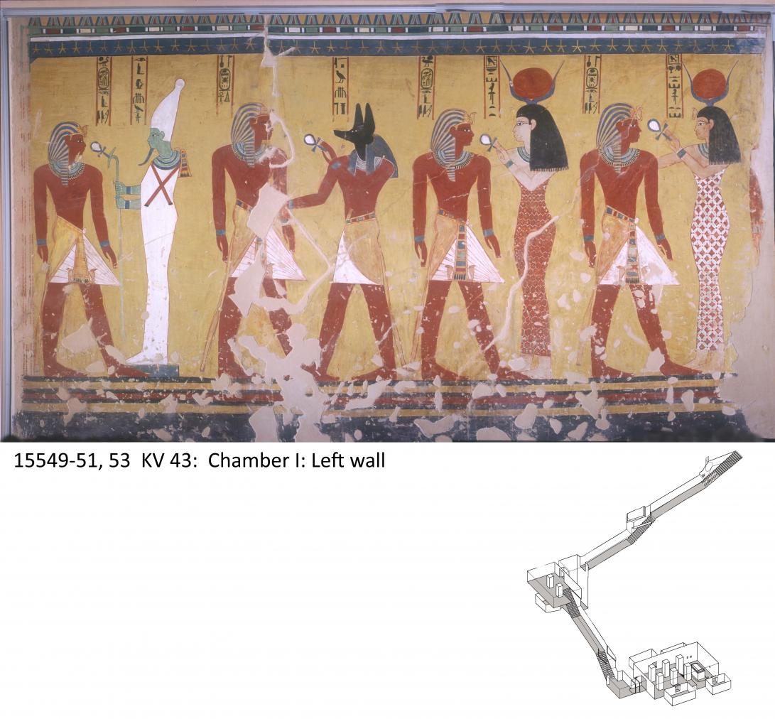 The entrance to KV 43 lies in the south branch of the southeast Wadi, high in the mountainside above and southeast of KV 19. Similar in plan to KV 35 (Amenhetep II), the first three corridors (B, C, D), the well chamber E and side chamber Ea follow a north-south axis. The side chamber Ea off the bottom of the shaft in well chamber E lies partly beneath pillared chamber F. At the latter chamber, the tomb axis turns ninety degrees to the left (east) and continues on a west-east axis to chamber I, after which it again turns ninety degrees to the left (north) to a south-north axis, giving access to burial chamber J and side chambers Ja-Jd. The tomb is decorated with representations of the king with various deities in well chamber E and chamber I.