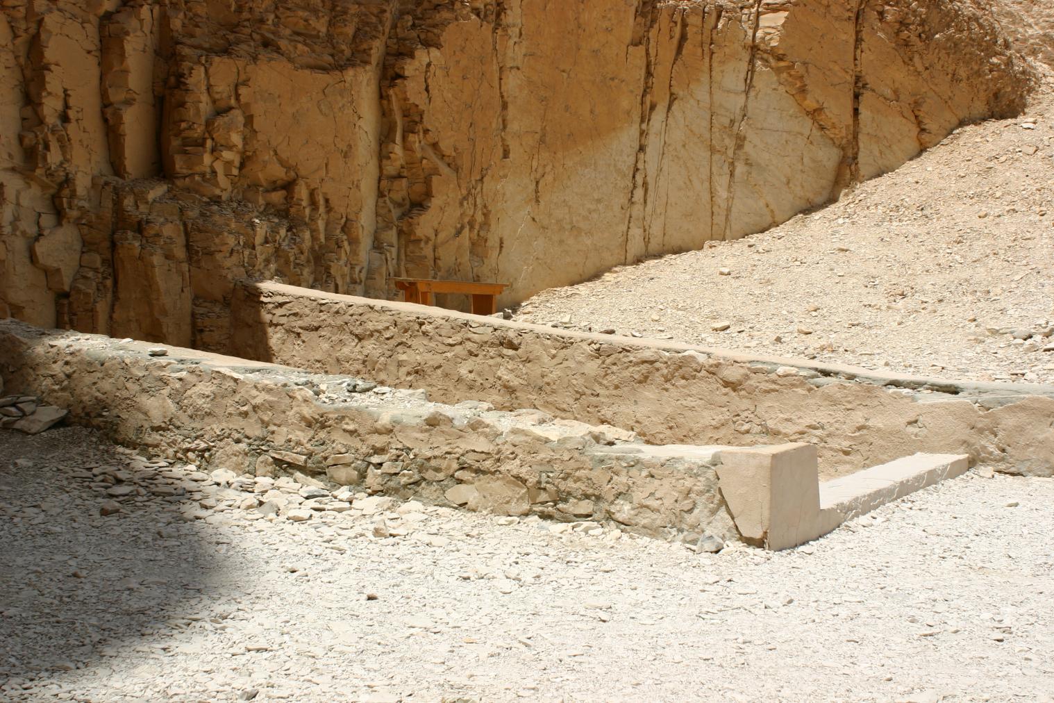 See entire tombThere are beam slots in the lintel of the gate. It was originally closed with a single leaf wooden door. Afterwards, it was blocked and plastered to prevent entry. From this point on, the tomb continues on a south-north axis. There is a ramp cut through the gate. The left (west) jamb has been cut back.