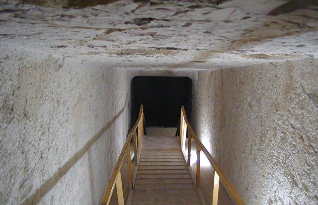 See entire tombThis long, narrow corridor has a sloping floor and ceiling.