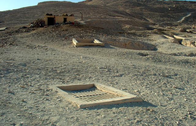 See entire tombShaft entrance with a cemented brick surround spanned by a metal grill with mesh.