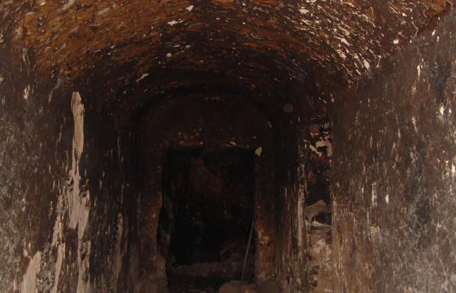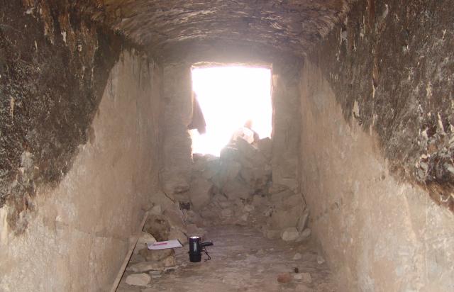 See entire tombThis corridor lies on axis with the tomb's entrance. The ceiling is vaulted and the remains of an unfinished side chamber are visible in the west wall. This was probably a later addition. There is evidence of the basal erosion of the walls in this corridor and plaster only remains on the lower parts and on the ceiling. The Franco-Egyptian Mission discovered fragments of linen, sherds, bones, and wood in the unfinished side chamber and the leg of mummy was found in the corridor.