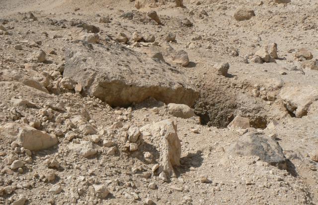 Concerns about structural stability prevented the GCI-SCA from assessing the interior of QV A. They record, however, that the area immediately adjacent to the entrance is severely eroded, and the shaft has been partially filled with debris. Erosion of the surrounding slope is the primary mechanism of decay. Water infiltration has also contributed to deterioration since the tombs were carved into a friable shale.
