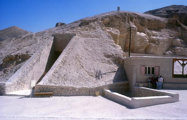 On the West Bank of the Nile across from modern Luxor, cut into the Theban Hills, lies the Valley of the Kings (KV). Chosen as the burial-place for most of Egypt’s New Kingdom rulers, it was selected for several reasons. It lies only a kilometer or so west of the temples and villages of the Theban people, it is a small valley surrounded by steep cliffs and is easily guarded, the bedrock in which it was cut by torrential rains millions of years ago is limestone of generally good quality, and towering above it is a mountain known today as the Qurn (meaning “the horn” in Arabic). The shape of the Qurn may have reminded the Egyptians of a pyramid, a shape associated with the sun god, Re, and long associated with royal burials.