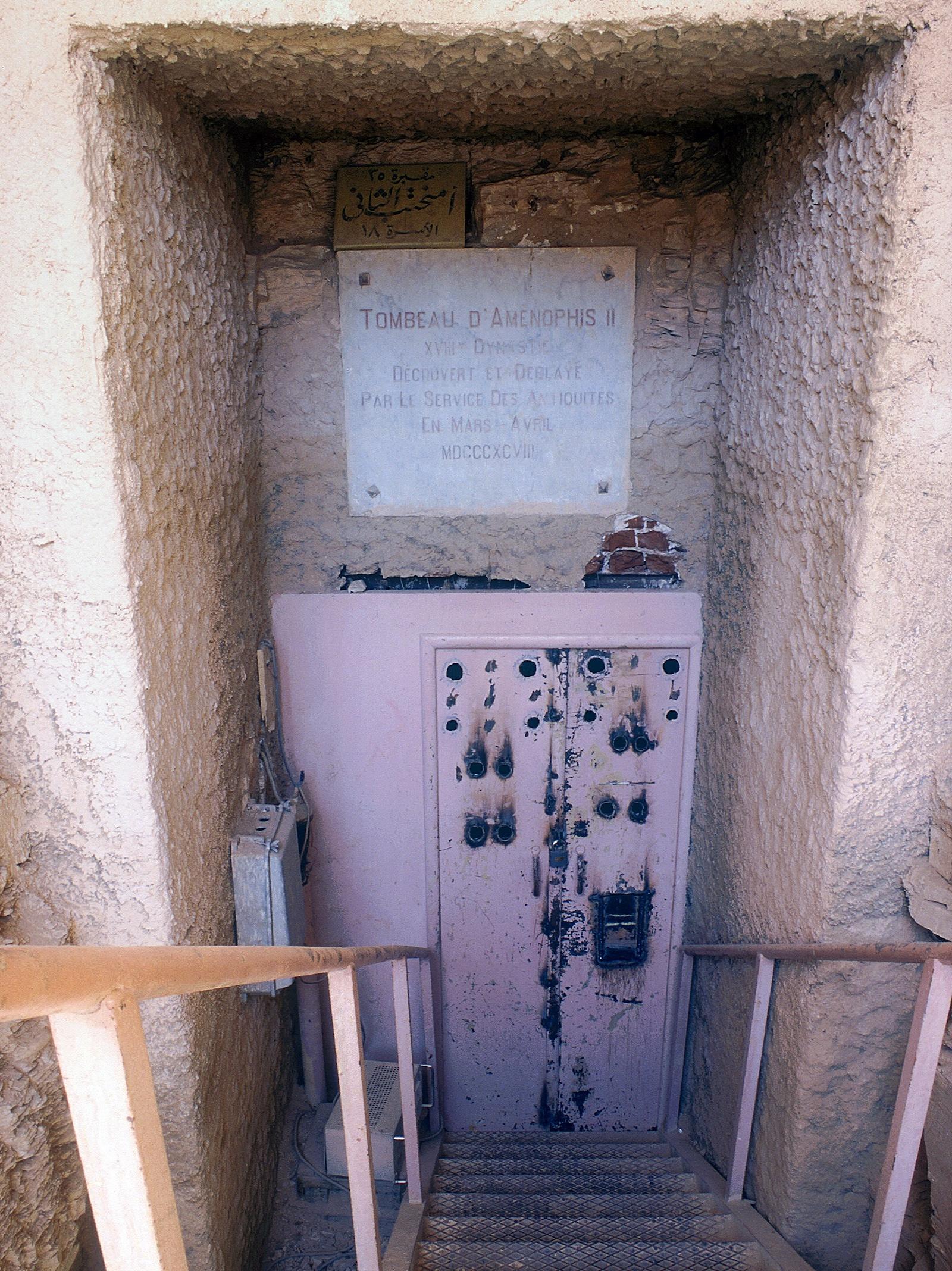 Modern staircase leading to modern door of tomb.