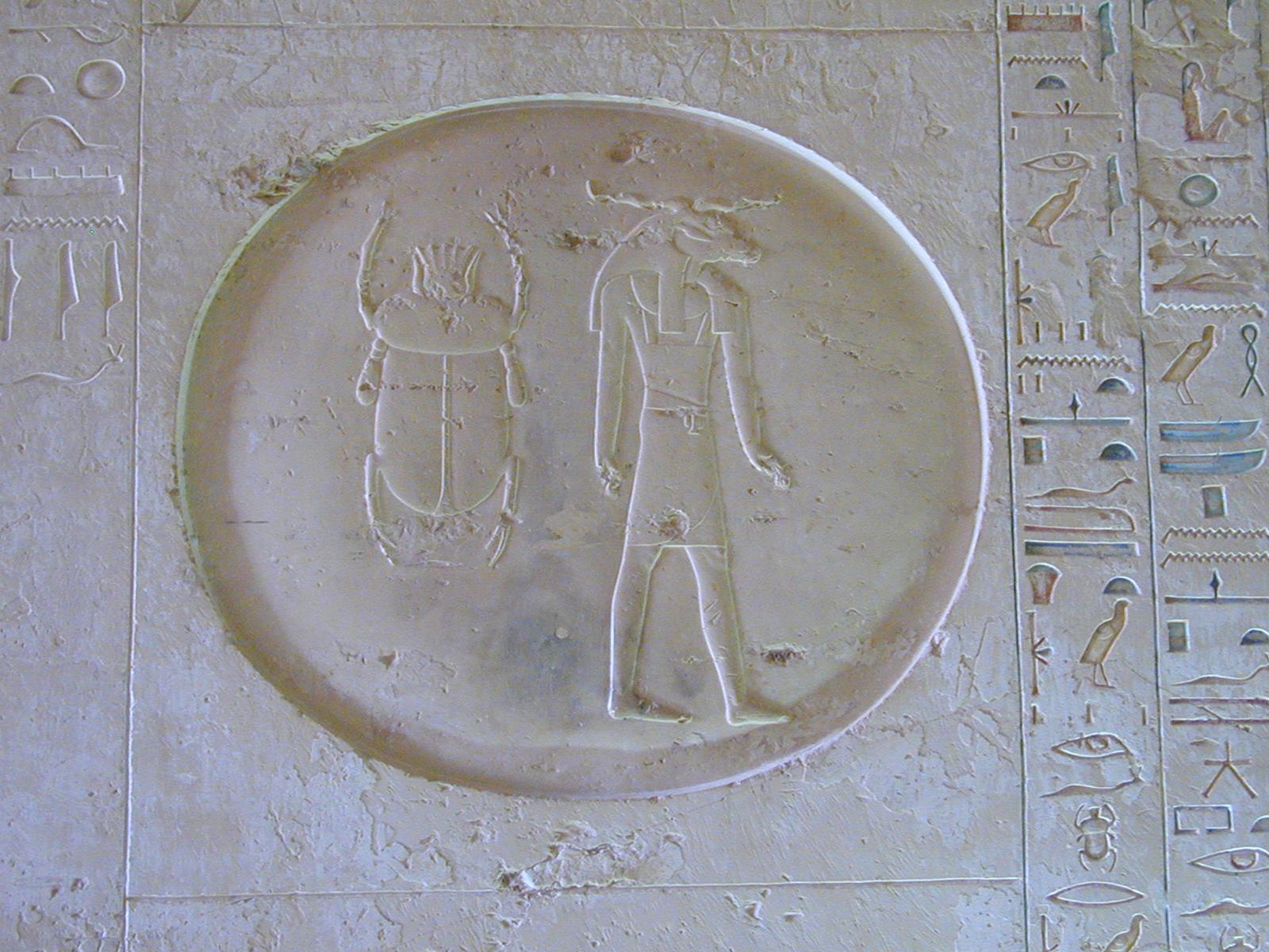 Detail of the Litany of Ra, the opening scene of the syncretic deity Ra-Khepri within a sun disc; left wall, left part, Corridor B. Courtesy of Richard Sellicks.