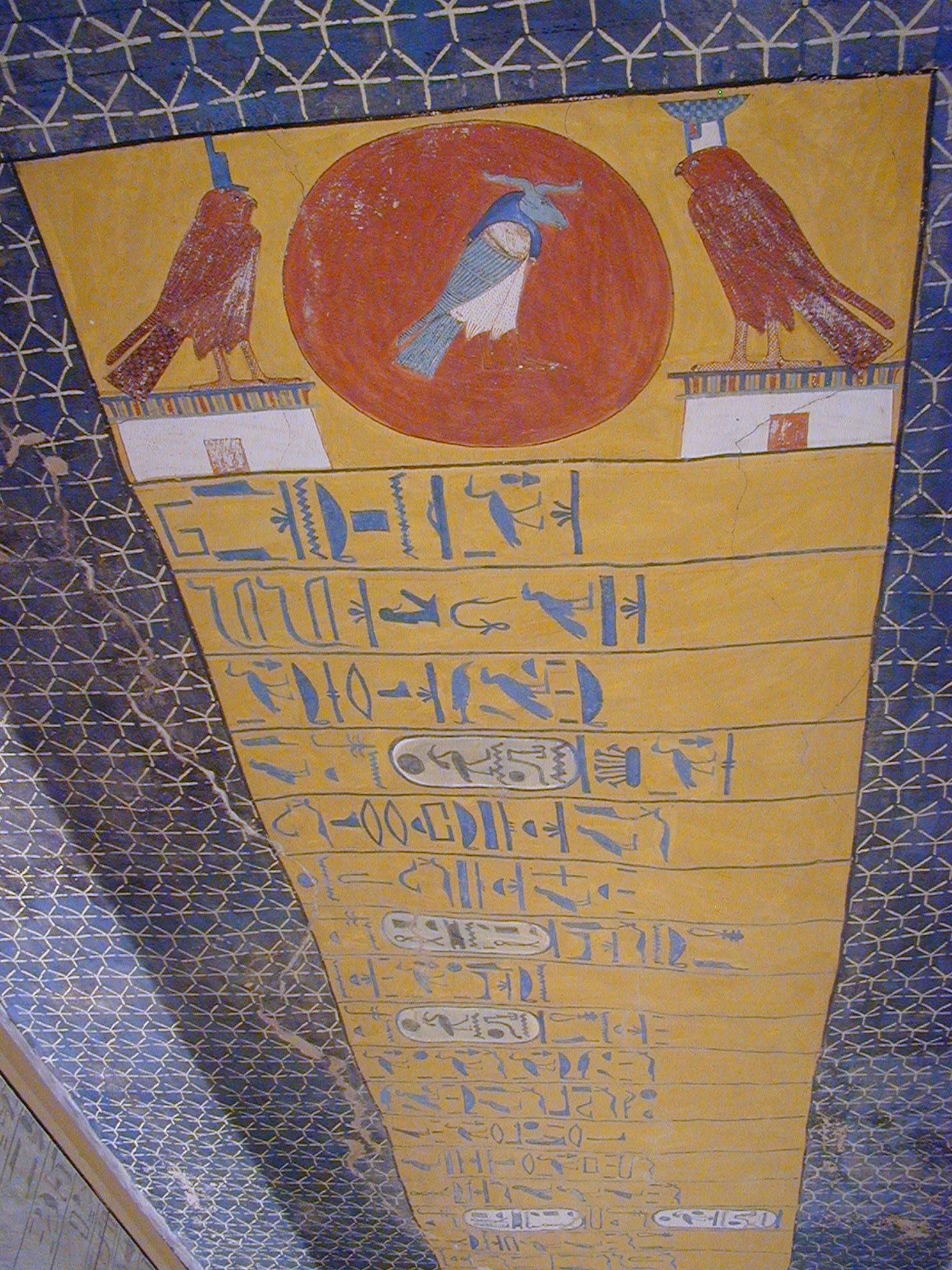 Corridor C, ceiling, center part. Text and stars; and a scene from the Litany of Ra, barbary sheep-headed ba of the deity Ra in a sun disc, flanked by the goddesses Isis and Nephthys as kites.