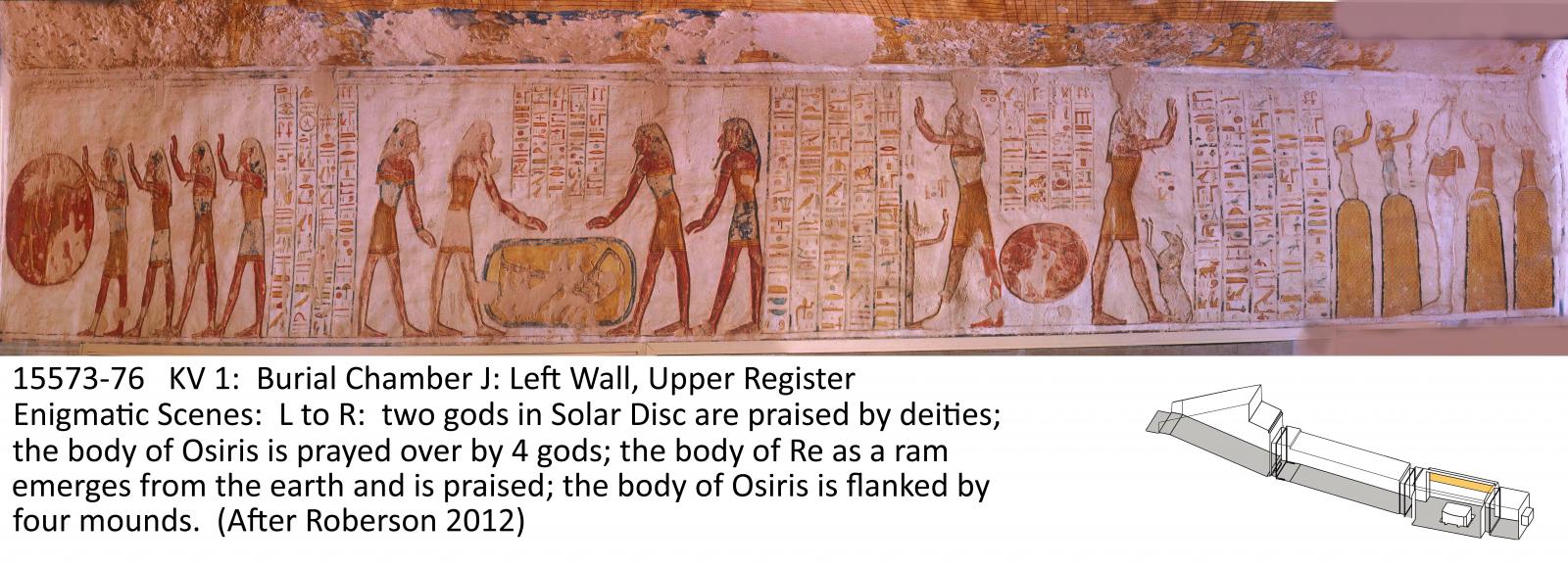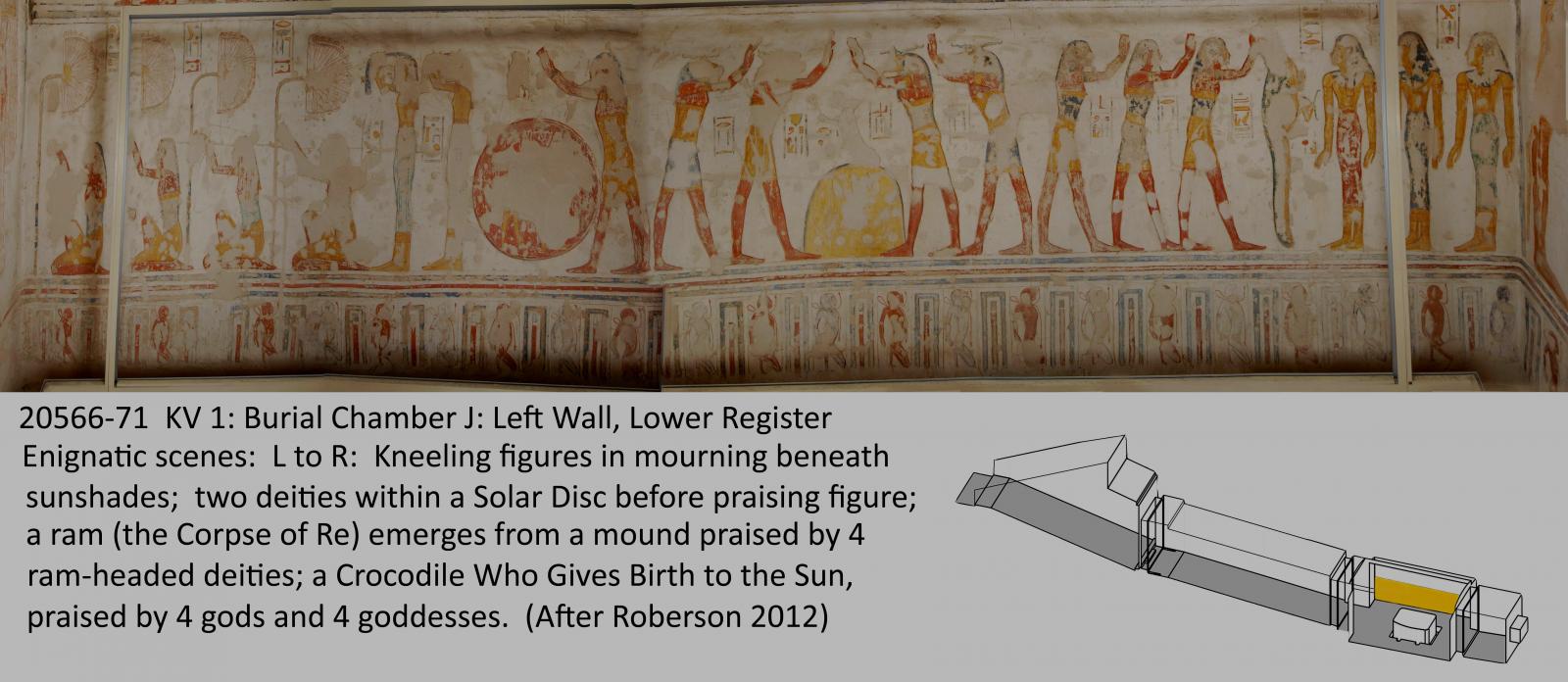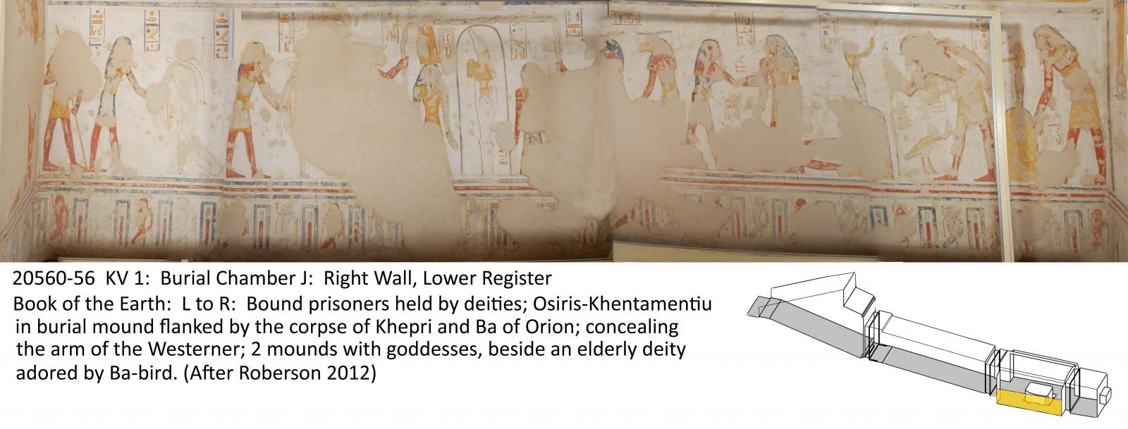 The entrance is cut into the base of a hill at the end of the first northwest branch Wadi. This unfinished tomb comprises an open entryway Ramp (A), corridor B, vaulted burial chamber J, and an unfinished chamber (K) with a rear recess. The walls are decorated with excerpts from the Book of Gates (chamber K), Book of Caverns (corridor B), Book of the Earth (burial chamber J), Opening of the Mouth ritual (corridor B), and the deceased with deities (corridor B, chamber K, burial chamber J). The ceilings are painted with motifs of flying vultures and astronomical figures. There are 135 Greek, and several Demotic, Coptic, and nineteenth century graffiti in the tomb, indicating that KV 1 has been accessible since antiquity.