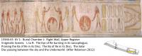 See entire tombThe decoration on the walls is painted sunk relief, and the ceiling is painted plaster. On the left (southwest) wall are three scenes. In the first, the king offers incense and libations to a seated figure of Ra-Horakhty-Atum-Khepri before offering stands bearing a sacrificial oryx, bouquets and food. The second scene is the initial scene and first division of the Book of Gates. The third is the Iwnmutef priest purifying the king as Osiris, derived from the Opening of the Mouth Ritual.