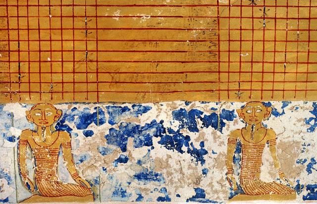 The vaulted part of the ceiling is decorated with two elongated figures of Nut placed back to back and flanked by duplicate representations of circumpolar constellations and decans. The lower, flat portions of the ceiling contain a grid of stars above kneeling figures, representing star clocks.