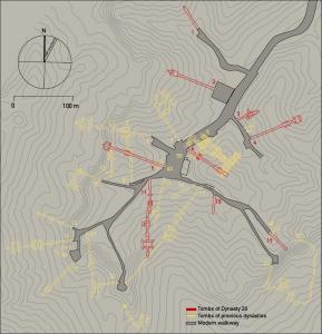 KV 42 has suffered from flood damage. Burial chamber J contains two pillars: the rear (west) one is damaged and the front (east) one is broken.
