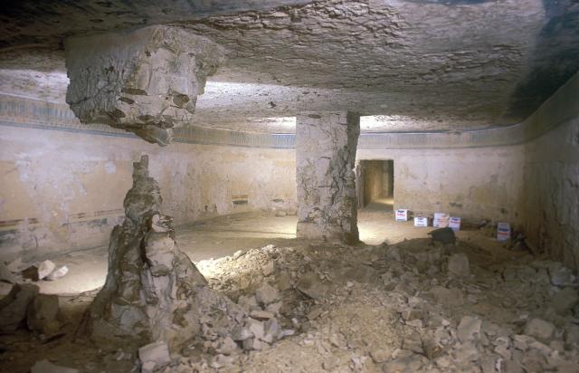 See entire tombThe burial chamber lies on an west-east axis and is cartouche-shaped. It has two pillars; the west one is damaged, the east one badly broken. The sarcophagus lies in the east section of the chamber. There is a kheker-frieze, a star pattern on the ceiling, and a band of color below the decorated area of the wall. Several copper pins are still in place at the top of the west wall. Holes for others can be seen on other walls. They may have served as pins for plumbbobs. The walls of the chamber were plastered, but the decoration was never finished.