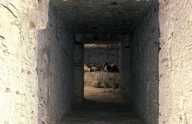 See entire tombThe recesses are almost completely filled with limestone chips. There are masons' marks on the left (east) and right (west) walls, and on the ceiling.