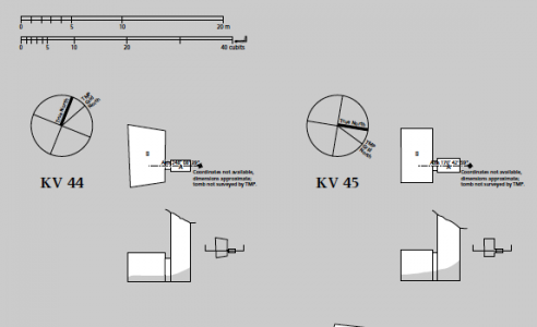 KV 45 is located in the southeast branch of the main Wadi, close to KV 44. The well-cut tomb consists of a shaft (A) and a small chamber (B). The tomb was found undecorated.