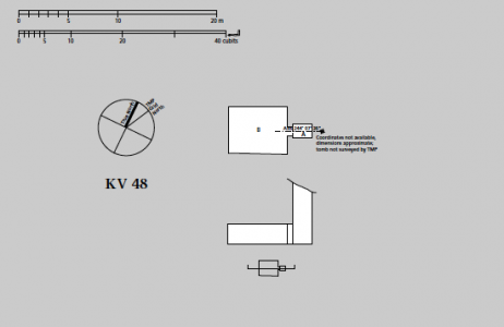 KV 49 is located in the west branch off the southwest Wadi. An entrance stairway (A) leads down to a gate (B) leading into a long, sloping corridor (B). This opens into a large, rectangular chamber (C). An unfinished descent (C) in this chamber indicates that the cutting of the tomb was never completed. The tomb was left undecorated.