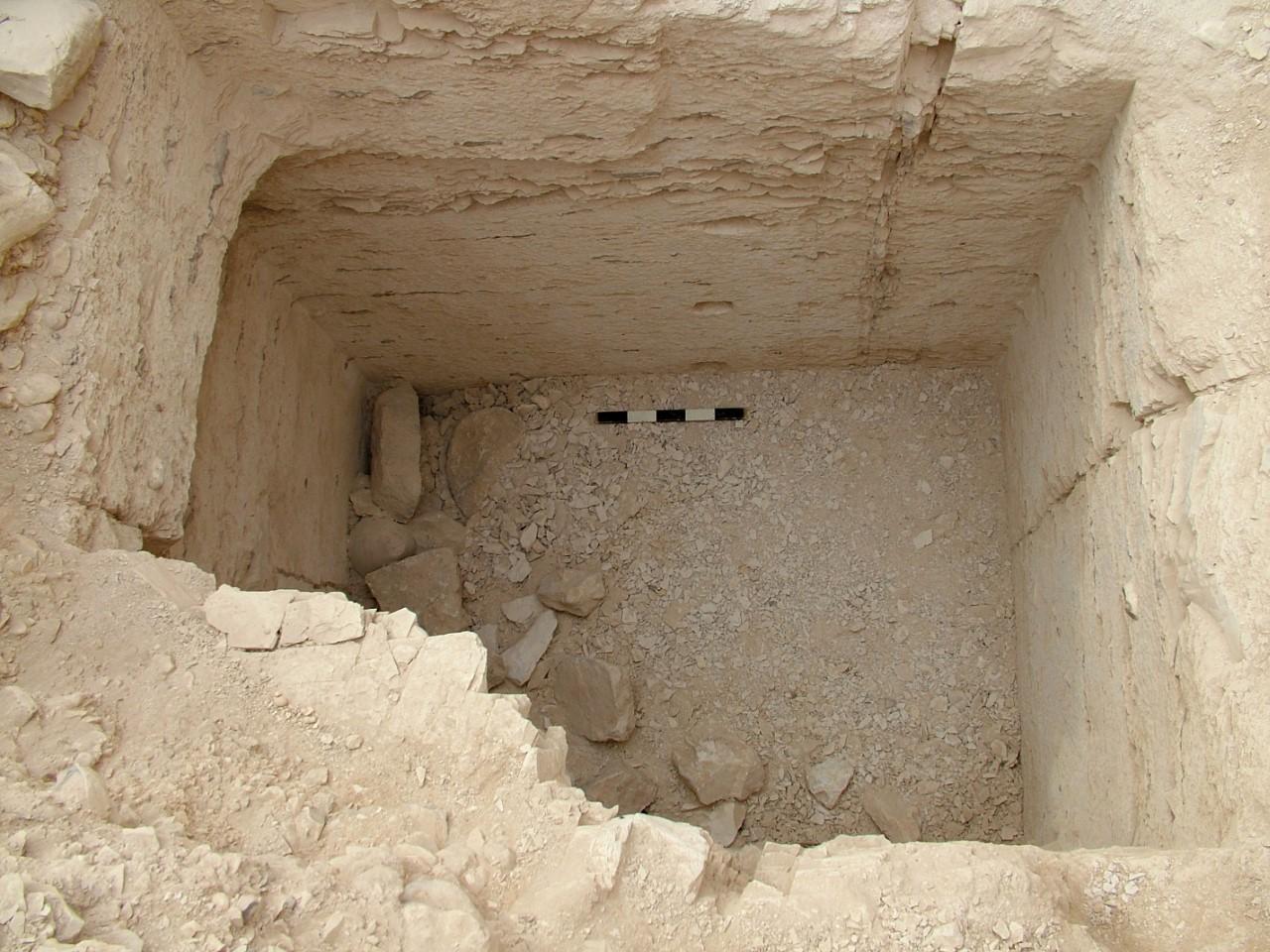 The Amenmesses Project, under the direction of Otto Schaden, was excavating the slope to the east of KV10, where the team had uncovered a series of workmen’s huts of the Ramesside period. At the bottom of the slope the outline of the shaft of KV63 was discovered in 2005 at the end of that year’s excavation season. The following year, 2006, the clearance of the shaft was carried out. The shaft led to a doorway to the south that was sealed with irregularly shaped pieces of limestone. There was some evidence that the chamber had been entered at least once, if not more than once, in antiquity, before being re-sealed.