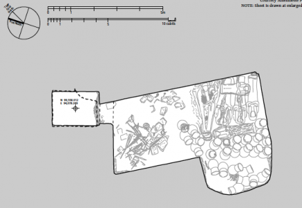 The eastern side of the room contained seven wooden coffins (an eighth Coffin, which was small, was inside one of the larger ones), and twenty-eight large storage jars to the west of the coffins. Once the material was removed to KV 10 for analysis, the coffins and storage jars were found to contain the remains of embalming materials. The analysis of the coffins, jars, and their contents is ongoing. Currently it is posited, based on the ceramics, coffins, and surviving fragments of sealings, that the remains are associated with a burial dating to the end of the Eighteenth Dynasty.