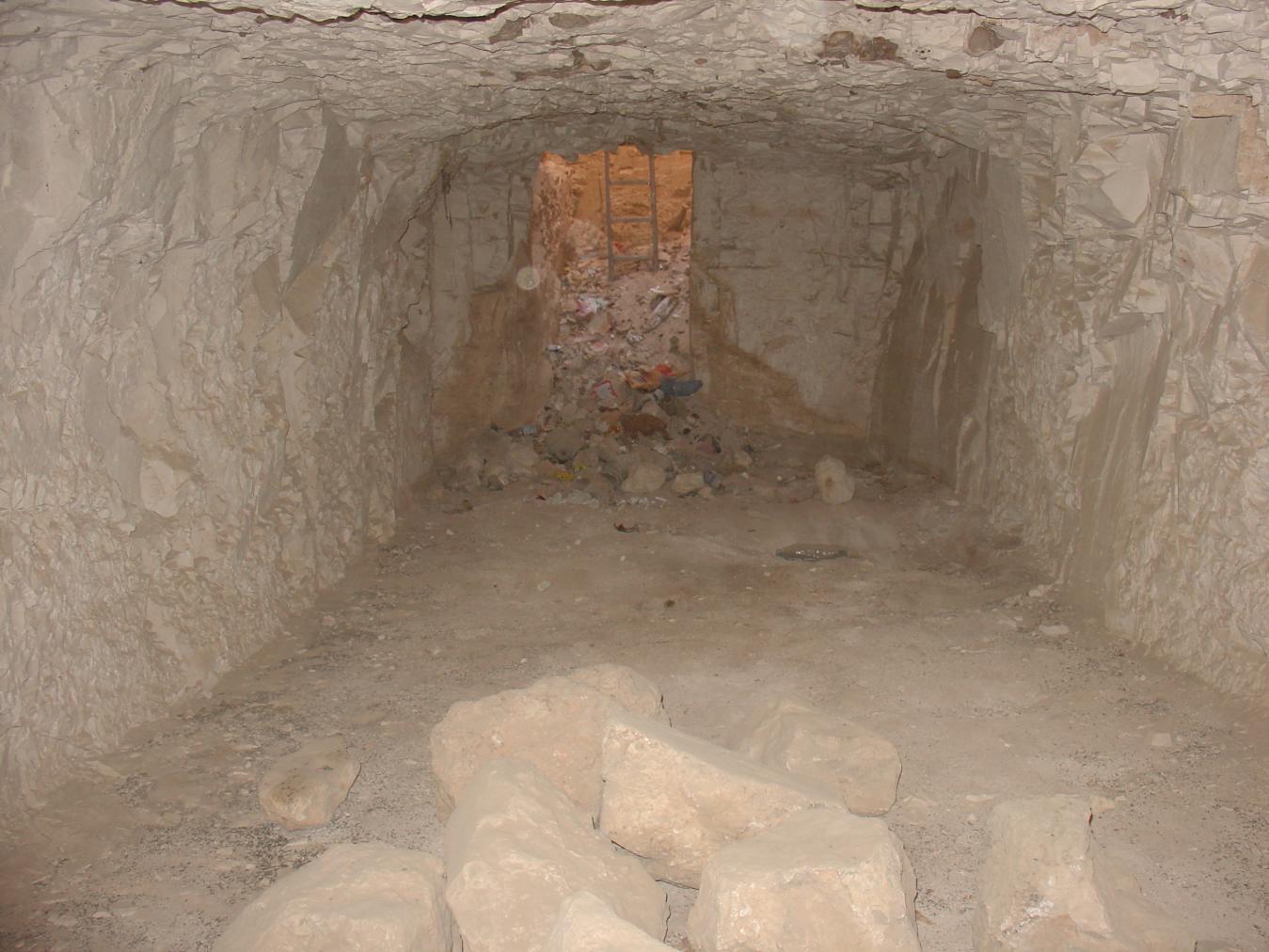 See entire tombShaft entrance has a modern masonry surround spanned by a metal grill or mesh.