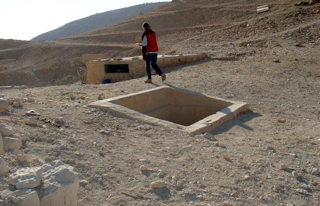 QV 19 is a single-chambered shaft tomb located on the south side of the main Wadi. It lies atop a low mound along a secondary footpath and its chamber (B) is perpendicular to and partially overlies the chamber of QV 20. The shaft (A) has a modern masonry surround spanned by a metal grill or mesh. The owner is unknown.