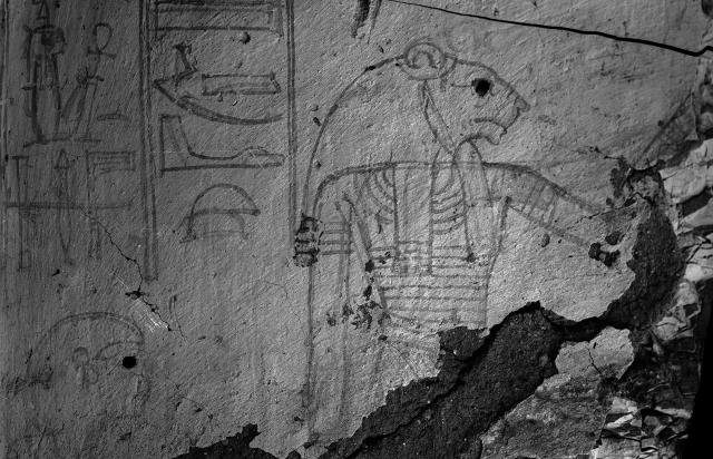 According to the GCI-SCA, the shale present in the rear parts of walls, ceiling and floor of chamber (C) is heavily jointed, and recent rock loss is evidenced by fallen rock fragments on the ground. Areas of the rear wall are affected by wide detachment of surface rock layers which threaten to fall. The marl in the front part of the chamber is also heavily jointed and fractured, and visible detachment of a surface area of the ceiling is present. Along the side walls vertical and diagonal open fractures are present, following the orientation of the shale layer below. Vertical salt veins are also present in the side walls. The east side of gate (C) has been partially rebuilt with masonry and the adjacent rock is severely fractured by vertical cracks. Chamber (B) does not exhibit any major structural concerns, though the extensive modern plaster repairs obscure much of the condition of the underlying rock. Large areas of painted plaster are lost at the base of all walls and on upper areas of the north and south walls and on the south end of the ceiling of chamber (B). The condition of the surviving areas of decoration is generally good, though again, the extensive plaster repairs may hide any underlying problems. The only area of concern is a large horizontal crack in the painted plaster above doorway (C) and on the south wall of chamber (B), which extends eastward into a network of cracks. The cracks adversely affect the figure on the east side of the south wall, likely to be a portrait of Satra, and is therefore of great significance. As the cracks also extend through repair plaster, this could be an indication of continued movement in the underlying rock. The majority of these cracks were then smeared over (unknown date) with a very fine and light-colored plaster. A fine network of cracks is also visible on the east and west walls of chamber (B), concentrated toward the south end of the tomb. There is also cracking on the ceiling, in particular cracks that run across the face of the figure Nut; though there has been no loss in this area. In general, cracking appears to be concentrated toward the rear, south side of the tomb. There are areas of delaminated plaster throughout, but none appear to be substantially endangering. The black painted lines appear stronger on the east wall than on areas of the west wall, where the red and black lines are fainter and less visible and in some areas are completely gone. Black resin-looking material is found on the surface of the painting in areas. This is likely to be historic material and should therefore not be removed.