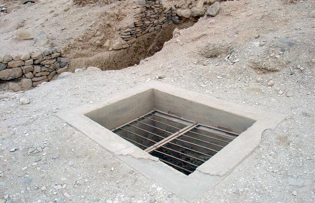 See entire tombThe shaft entrance has a modern built surround with cement plaster and a metal grill with no mesh.