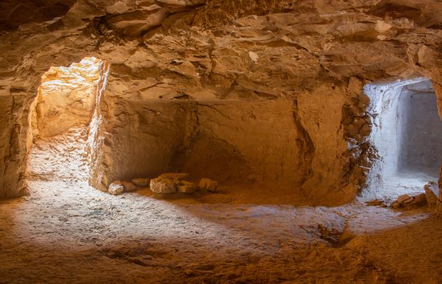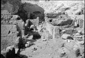 Except for a few Palaeolithic stone tools, there is little evidence of human activity in QV and subsidiary wadis before the 18th Dynasty. Then, perhaps because of the valley’s convenient location, it became an increasingly common site for the burials of minor members of the royal family, gradually replacing the outlying western wadis as the principal burial site. As important as location when determining the burial site for royal family members, Egyptologists believe that a small grotto in the cliffs at the southwestern limit of QV reminded ancient priests of the vulva of the goddess Hathor, an appropriate symbol to accompany the burials of royal children, wives, and mothers. That grotto would fill with water when it rained, then drain along a small, natural watercourse through the middle of QV, emptying into the desert outside the valley’s entrance. QV tombs were dug on either side of this watercourse - 18th Dynasty tombs lay close beside it; early 19th Dynasty tombs clustered at the base of low hills to its southwest; later 19th Dynasty tombs lay to its north; and 20th Dynasty tombs were dug to its south and west. Egyptologists have identified a small dam, believed to have been built in the 20th Dynasty reign of Ramesses III, to divert water that poured from the grotto and threatened low-lying 19th Dynasty tombs. Constructed of roughly-cut local stone, the simple dam stood one meter high and 18 meters long. A large section of it can still be seen today. After the New Kingdom, in Late Dynastic through Ptolemaic times, few tombs were dug in QV, but several earlier tombs were reused, often for multiple burials. Some were filled with as many as a hundred human or avian mummies. Later, QV was ignored - there were neither new tombs dug nor graffiti written on earlier tomb walls. This isolation, however, did appeal to 4th-century CE Christian monks. They built a monastery here, Dayr al-Rumi, and several QV tombs were reused as monastic cells. Other hermitages were established on the adjacent hillside (e.g., in the Valley of Prince Ahmose). This Christian use continued for three centuries, until the coming of Islam in the 7th century AD.